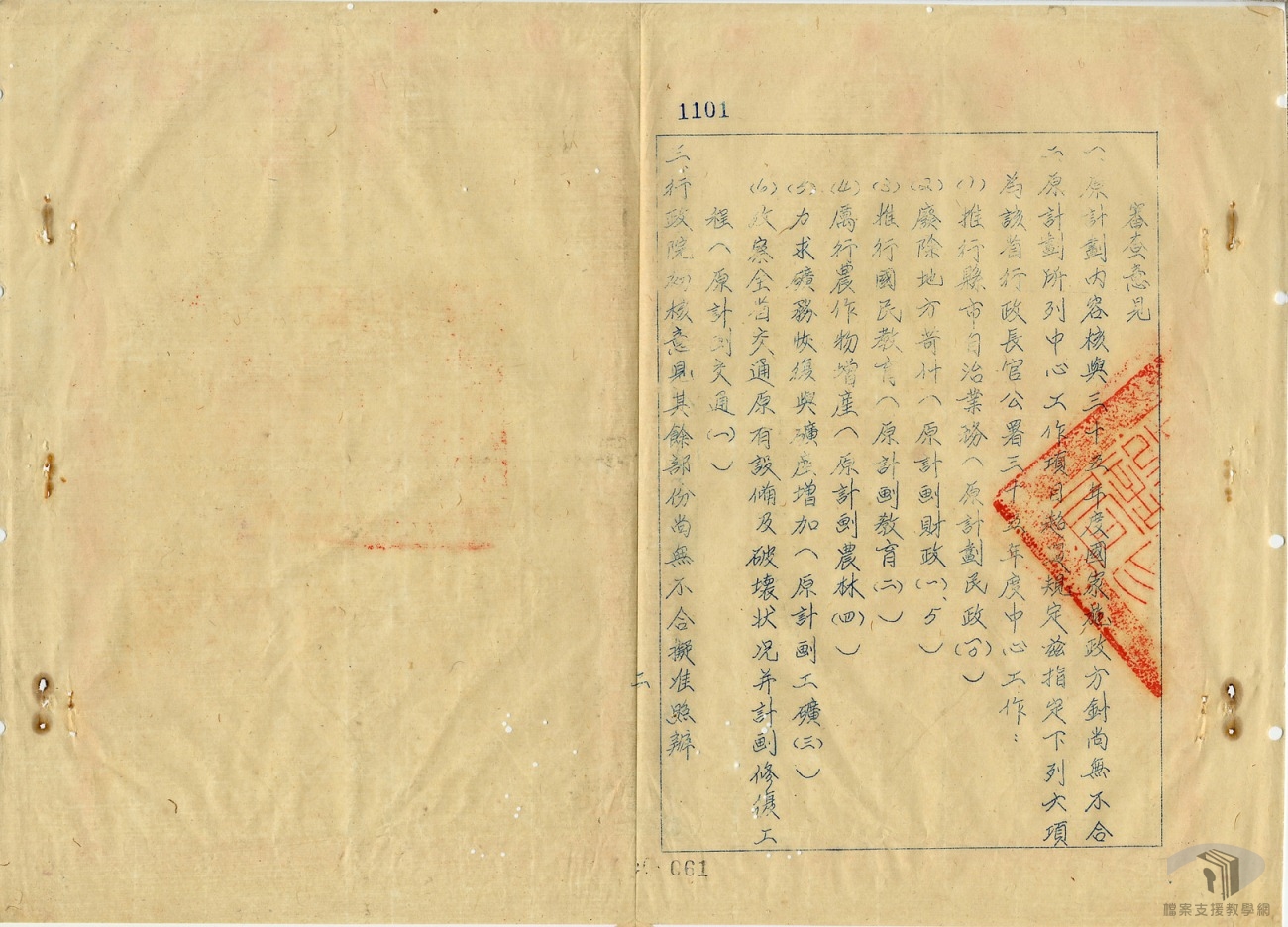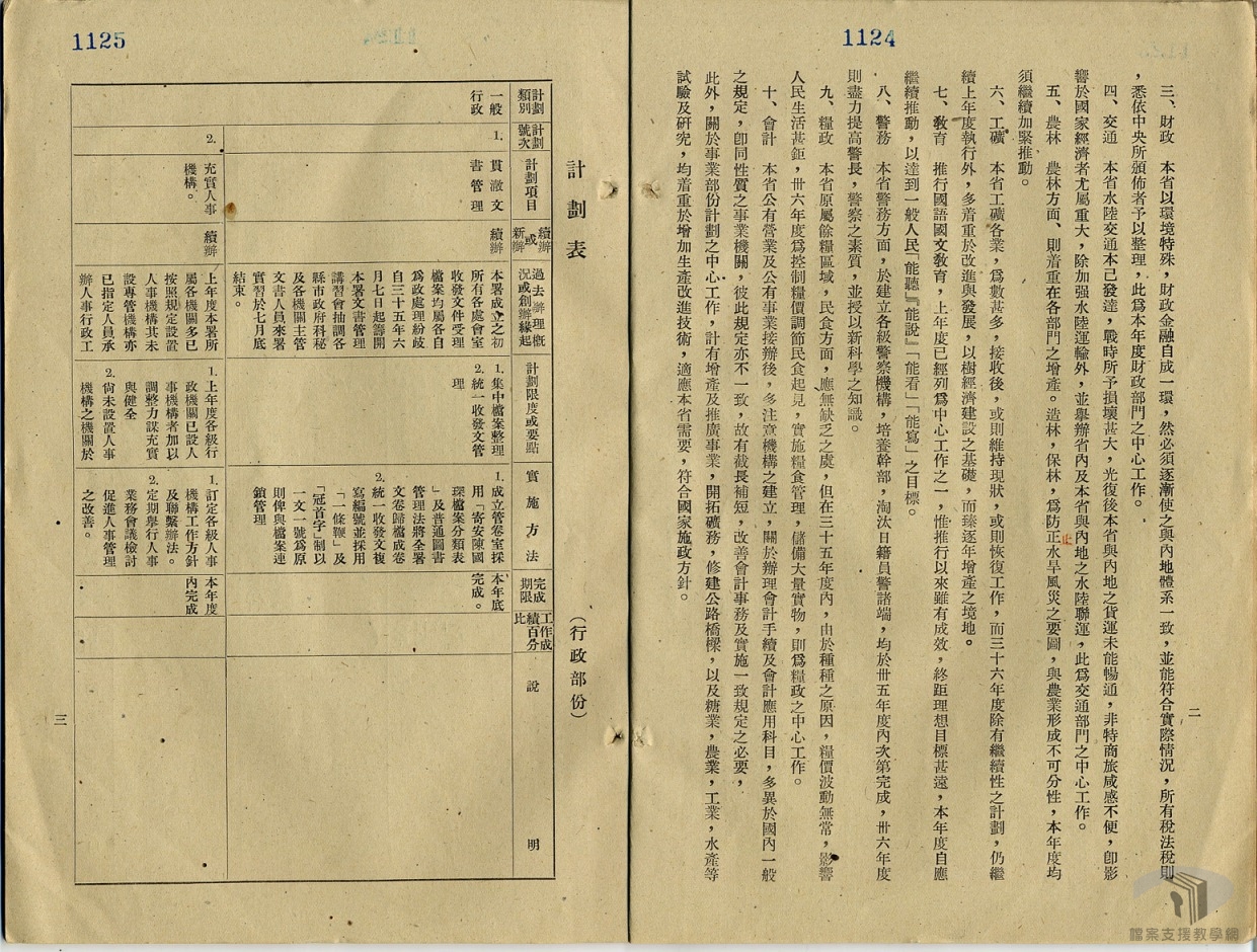 光復後,臺灣省行政長官公署一方面忙於接收,另一方面又要針對臺灣現況擬妥工作計畫。民國35年(1946)6月29日向行政院提出第一次完整年度的工作計畫,7月19日行政院要求各相關部會於1週內核復,9月24日行政院將彙整後之初核意見,函請國民政府主計處與中央設計局查照、以及查核辦理。10月30日中央設計局將審核意見函請行政院查照,並函送國防最高委員會秘書廳轉陳核辦。10月26日臺灣省行政長官公署再向行政院提出36年度工作計畫,至臺灣省行政長官公署被撤銷,共提出35年與36年兩個年度的工作計畫。