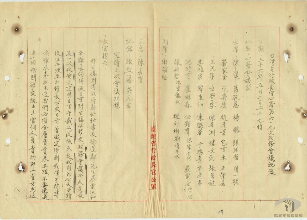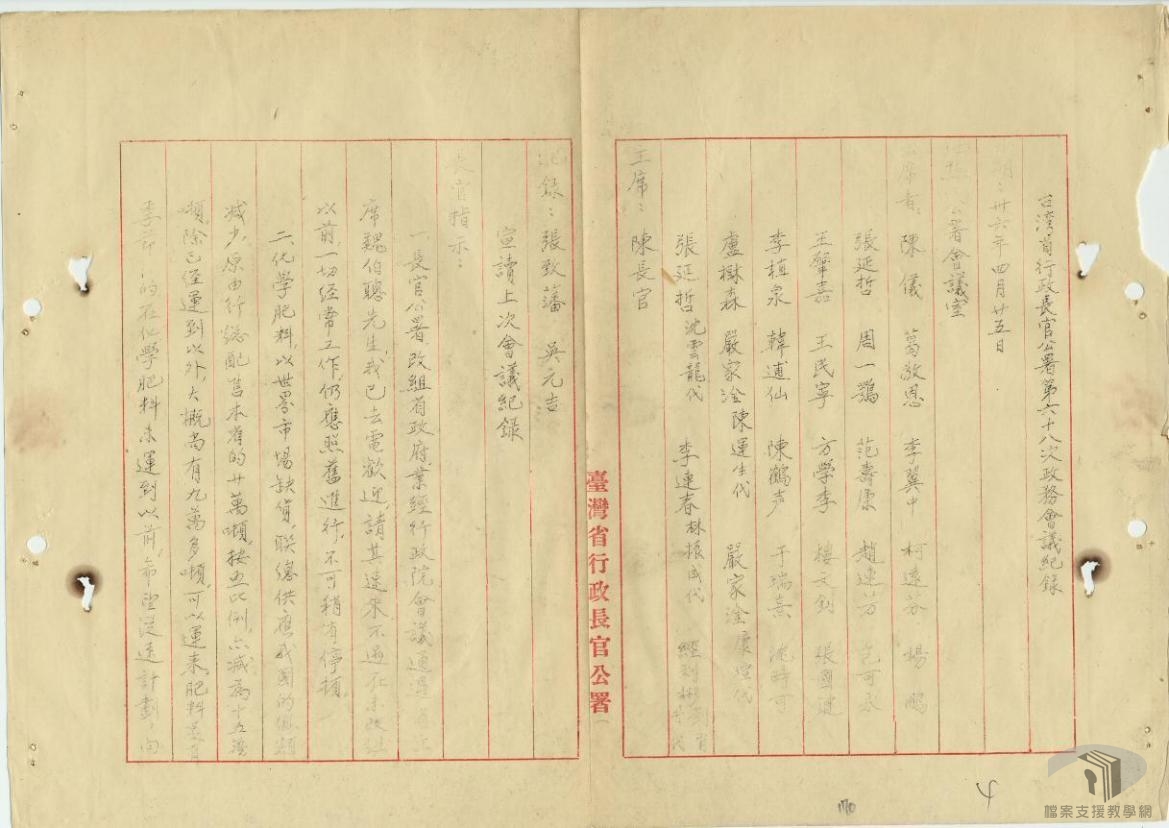 臺灣省行政長官陳儀為瞭解臺灣省行政長官公署各處(局)的施政進度與其待決的問題,並讓各處(局)也能瞭解該行政長官公署的施政重點,特舉行政務會議,除了直接給予指示外,亦在會中透過與他處(局)橫向連繫提出解決方案。政務會議原則上1個星期召開1次會議,至民國36年(1947)5月16日臺灣省行政長官公署被撤銷,共舉行過69次的政務會議(按:第六十九次於5月2日舉行)。