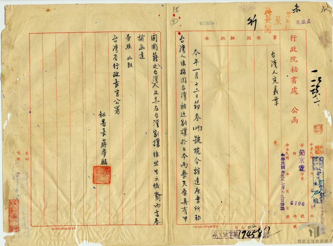 民國34年(1945)10月25日臺灣光復,臺灣人民自此日起恢復中國國籍,而臺灣人的定義,則係依據行政院民國35年(1946)1月12日節?字第1297號院令所稱,臺灣被迫割讓於日本而喪失原有中國國籍之臺灣人,及其在臺灣割讓後出生之後裔。惟旅居國外臺灣人為數不少,願恢復國籍者可於35年10月25日以前逕向當地大使館或領事館申請登記恢復國籍;若不願恢復國籍,自願歸化日本者,只要提出合理原因,通常照准。