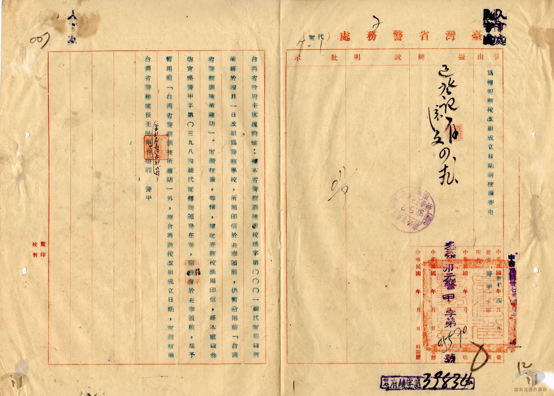 臺灣光復後,臺灣省行政長官公署為求改造臺籍官警5千餘人,特於10月27日設立臺灣省警察訓練所,一方面輪調臺籍官警授以中華民國之警察教育,一方面招考臺籍優秀青年,採取速成教育方式,施以3至6個月之訓練,即行分發服務,同時各種業務警察,亦開始講習,至民國37年(1948)止,該訓練所計辦各種講習50餘班期,時間長短不等。37年4月1日,臺灣警察訓練所奉令改組為臺灣省警察學校,專辦警員班,規定教育時間為1年。