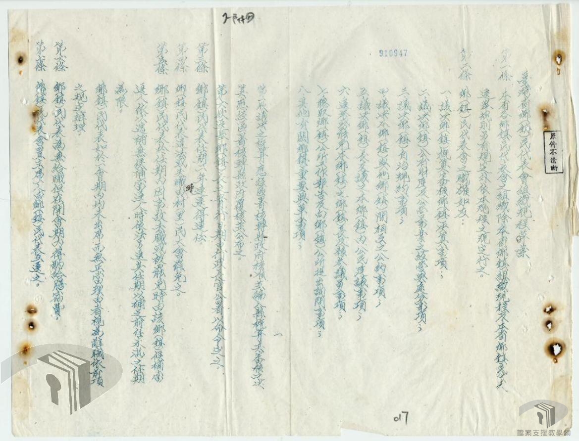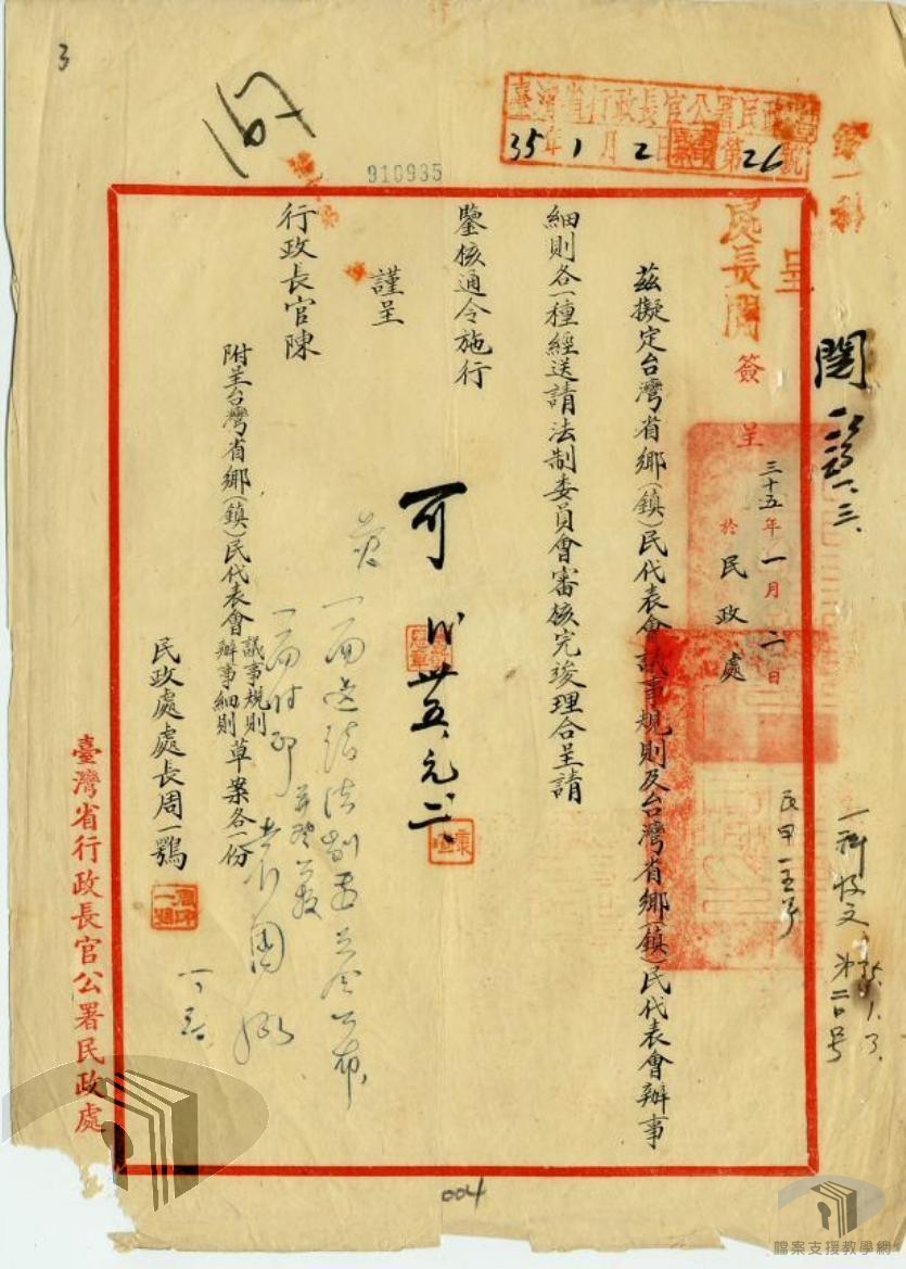 依據民國35年(1946)1月19日臺灣省行政長官公署公布「臺灣省鄉鎮組織規程」,鄉鎮設鄉鎮民代表會,由該鄉鎮之村里民大會選舉代表組織之。鄉鎮民代表之選舉則係依據「臺灣省各級民意機關成立方案」之規定,於35年12月全省各地首先成立村里民大會,村里民大會係由各該村里全體公民組成,並由村里民大會選舉出鄉鎮民代表,成立鄉鎮民代表會。鄉鎮民代表會之職權包括:一、議決鄉鎮概算,審核鄉鎮決算事項;二、議決鄉鎮自治規約;三、議決本鄉鎮與他鄉鎮間相互之公約;四、議決鄉鎮公有財產及公營事業之經營處分事項;五、議決關於鄉鎮不動產之管理及處分事項;六、議決關於設置管理及處分鄉鎮基本財產及公積金積穀等事項;七、議決除歲入歲出所定者外,另為義務負擔及權利放棄事項;八、議決關於鄉鎮舉債之決定或變更及利率與償還方法;九、選舉或罷免鄉鎮長、副鄉鎮長;十、選舉或罷免本鄉鎮之縣參議員;十一、聽取鄉鎮公所工作報告,及向鄉鎮公所提出詢問事項;十二、其他有關鄉鎮重要興革事項。