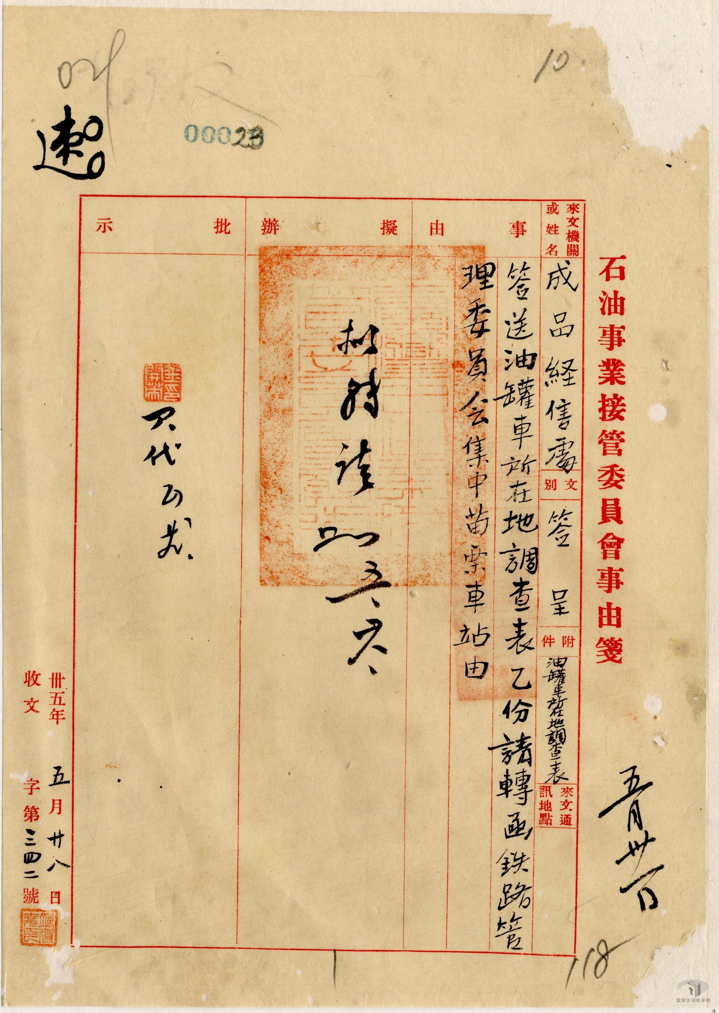 日據時期,臺灣的石油產業相當發達。光復之初,石油事業接管委員會負責接收日產石油事業。民國35年(1946)6月1日,中國石油有限公司於上海成立,為國營事業,隸屬資源委員會(按:民國38年(1949)隨政府播遷來臺後,改隸經濟部)。中國石油有限公司成立之後,隨即在臺灣設立臺灣營業所,除了持續接收日產外,也從事油氣之進口、開發、煉製、輸儲與銷售,以及石油化學原料之生產供應。