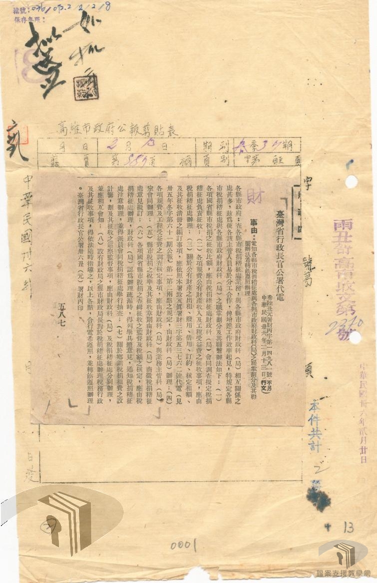 光復後,臺灣各縣市成立稅務稽徵處(所),民國36(1947)年擴大編制為稅捐稽徵處(所),受臺灣省政府財政處監督,負責轄區國、省及地方各種稅捐稽徵事宜。此外,由於各縣市稅捐稽徵處業務與各縣市政府財政科(局)關係密切,為使各該主管人員易於分工合作,俾增進工作效率起見,36年2月13日臺灣省行政長官公署通知各縣市政府,依照「各縣市稅捐稽徵處與各縣市政府財政科(局)之職掌劃分及其聯繫辦法」規定辦理。