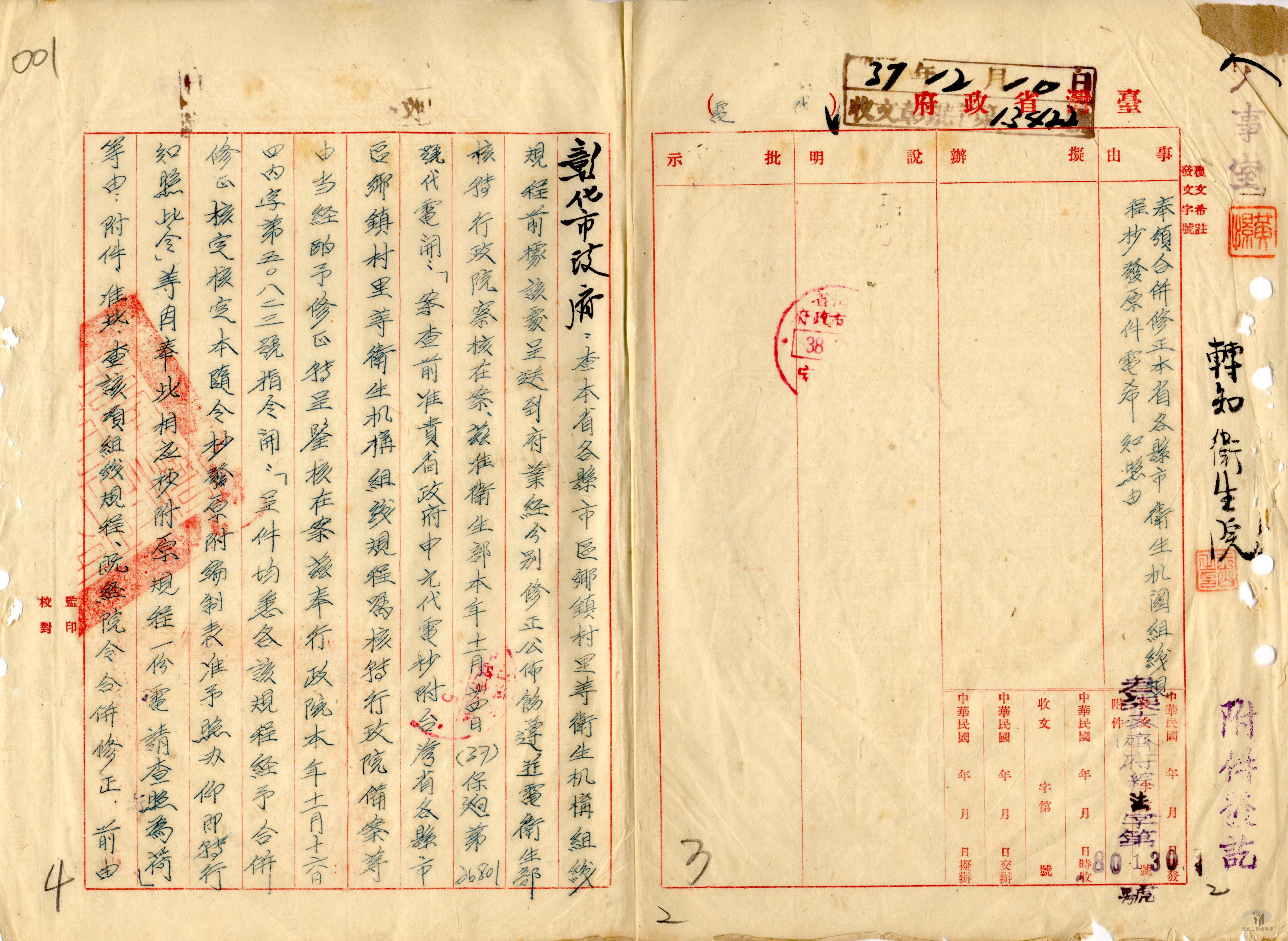 光復後,臺灣省八縣九市置衛生院,掌理地方衛生行政事務,衛生院設置醫政、防疫、保健、總務等股,並兼設衛生分院、衛生所、保健所、瘧疾防治所以及傳染病院等,以完善公共衛生實務。民國37年(1948)12月8日,臺灣省政府公布「臺灣省各縣(市)衛生機關組織規程」,依規定縣(市)設衛生院,並依人口數分甲、乙、丙三等,掌理各縣(市)衛生行政及技術事宜,衛生院所在地若未設有省立醫院者,應設立門診部及20至40病床之病室,超出者可將醫院之醫療部分劃出成立縣(市)醫院;而各縣(市)得視實際需要及地方財力、人力、物力,酌設傳染病院、花柳病防治所、瘧疾防治所、結核病防治所、砂眼防治所、婦嬰保健所、托兒所等機構。