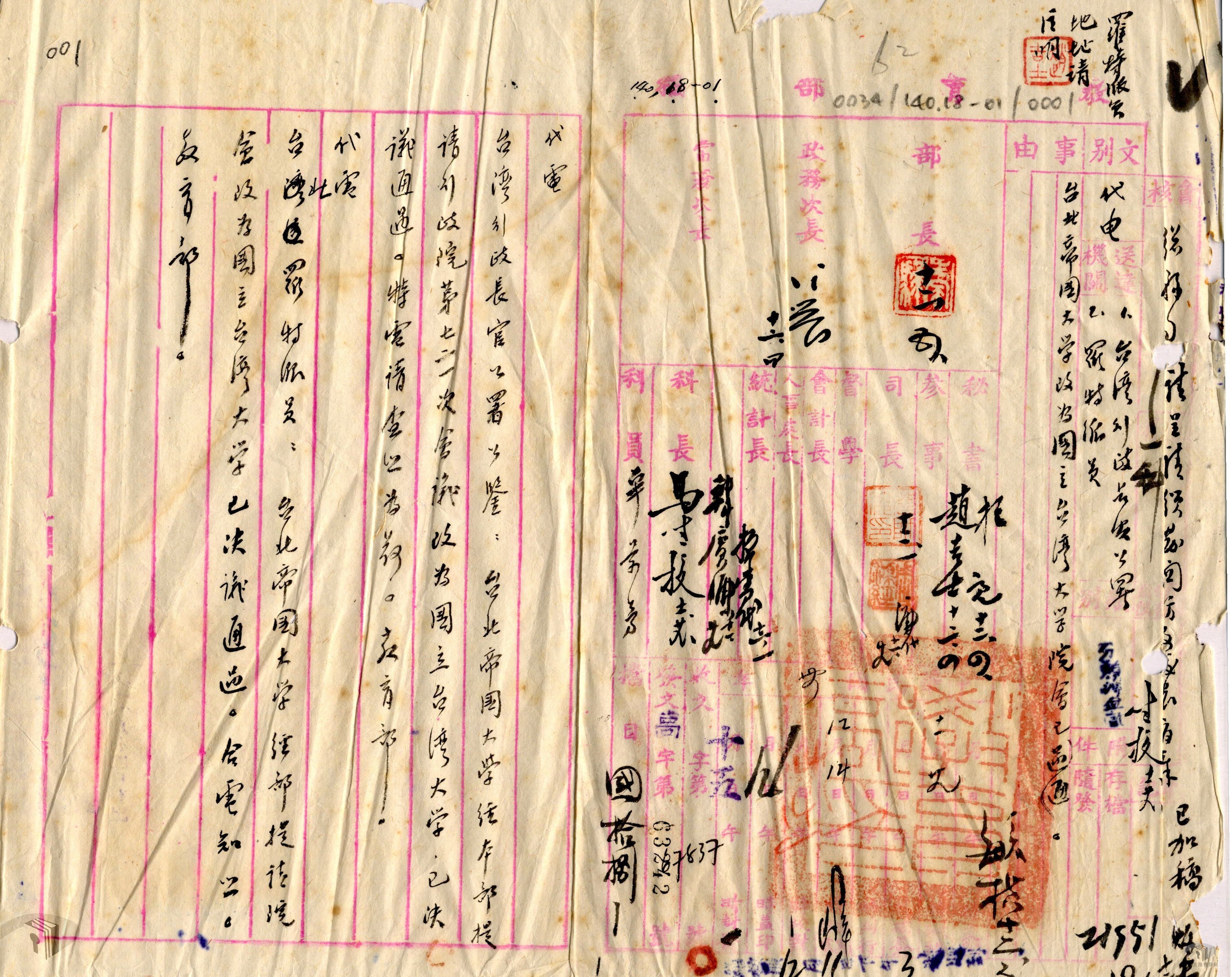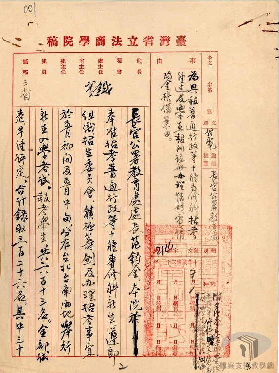 光復後,臺灣省行政長官公署對於日據時期臺灣高等教育機構進行接收改制,其中包括臺中農林專門學校(改名為臺灣省立農學院,國立中興大學前身)、臺北經濟專門學校(改名為臺灣省立法商學院,民國36年[1947]1月併入國立臺灣大學法學院)、臺南工業專門學校(改制為臺灣省立工學院,國立成功大學前身)、臺北帝國大學(改名為國立臺灣大學)皆予以更名改制。除此之外,亦積極增設院校及科系,以配合臺灣社會的發展。