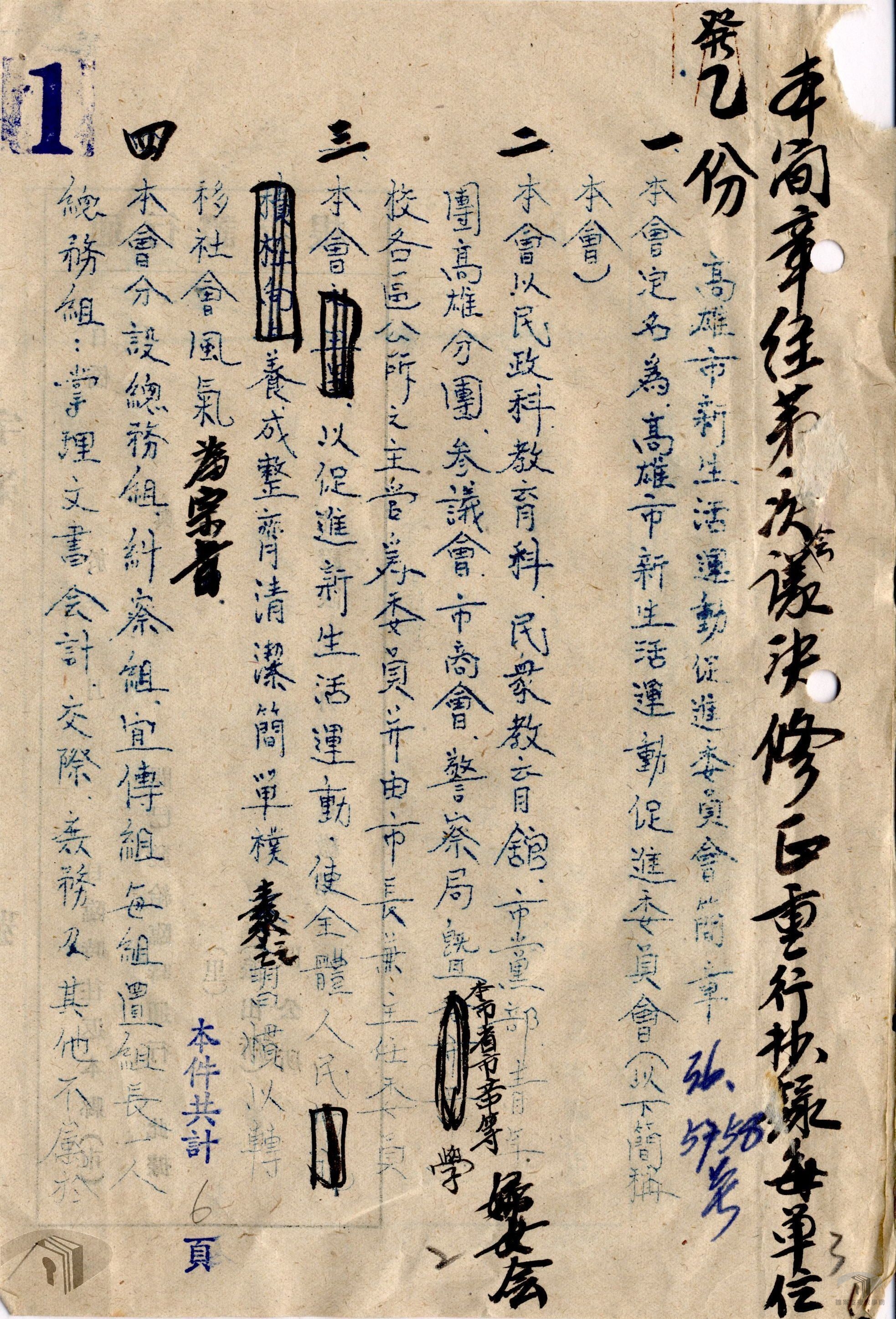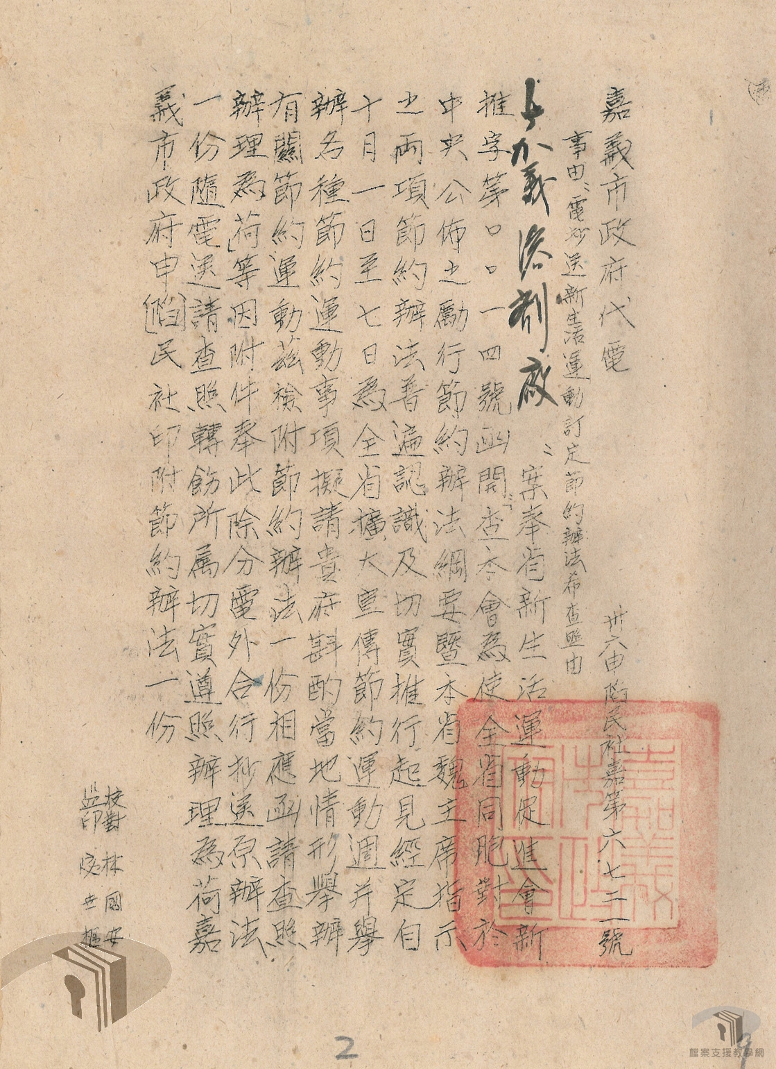 民國23年(1934)開始, 提倡新生活運動,係屬公民教育運動,以「禮義廉恥」為核心思想,並要求全國國民在食、衣、住、行四個方面澈底革除陋習,養成良好習慣。光復後,新生活運動亦被引進臺灣,除了熱烈慶祝新生活運動週年紀念日活動,也比照其他省分,成立省、縣(市)新生活運動促進會,推廣新生活運動。例如,臺灣省新生活運動促進會,曾以自民國36年(1947)10月1日至7日為全省擴大宣傳節約運動週,要求各縣市政府舉辦各種節約運動,其中「節約標語」及「新生活運動標語」,令人印象深刻。