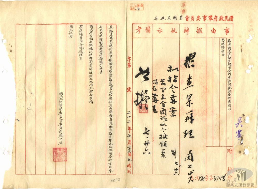 民國25年(1936)12月12日,西北剿匪副司令張學良與楊虎城,於西安發動「兵變」劫持蔣中正,此即「西安事變」。事件和平解決後,民國26年(1937)1月,裁撤西北剿匪總部,改變「攘外必先安內」的基本國策,對中共問題尋求政治解決。民國26年(1937)2月起,國民政府與中共談判,中共同意結束分離主義、暫緩階級鬥爭運動,國民政府則宣布承認中共合法,並同意將紅軍改編為國民革命軍第八路軍,稱之為「國共合作」。
