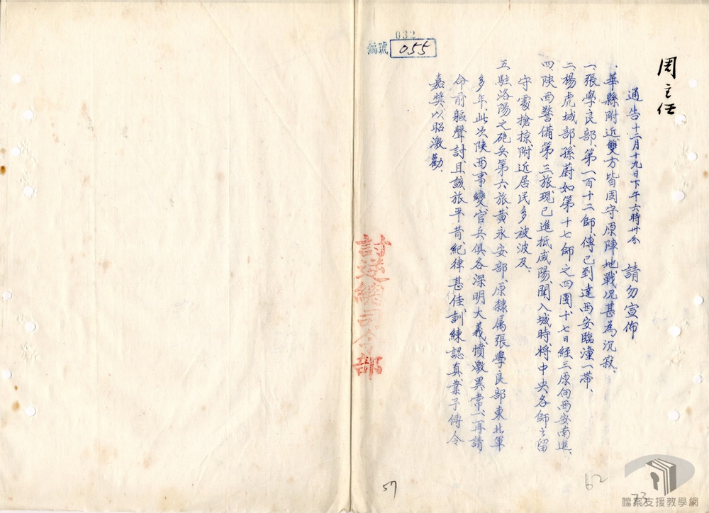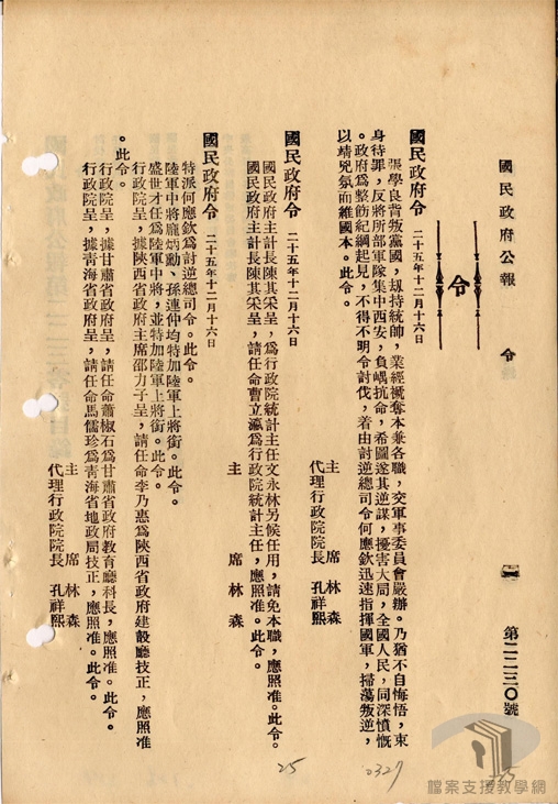 民國26年(1937)1月4日,張學良獲得特赦,實則遭到軟禁。同月,國民政府撤銷西北剿匪總司令部,任命顧祝同為西安行營主任,剿共軍事行動中止。