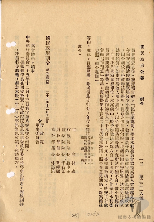 民國25年(1936)12月12日,西北剿匪副司令張學良與楊虎城,於西安發動「兵變」劫持蔣中正,此即「西安事變」。事件和平解決後,民國26年(1937)1月,裁撤西北剿匪總部,改變「攘外必先安內」的基本國策,對中共問題尋求政治解決。民國26年(1937)2月起,國民政府與中共談判,中共同意結束分離主義、暫緩階級鬥爭運動,國民政府則宣布承認中共合法,並同意將紅軍改編為國民革命軍第八路軍,稱之為「國共合作」。