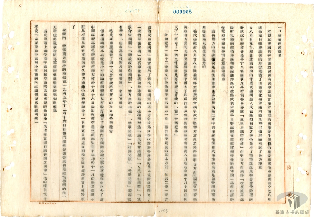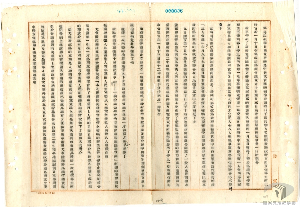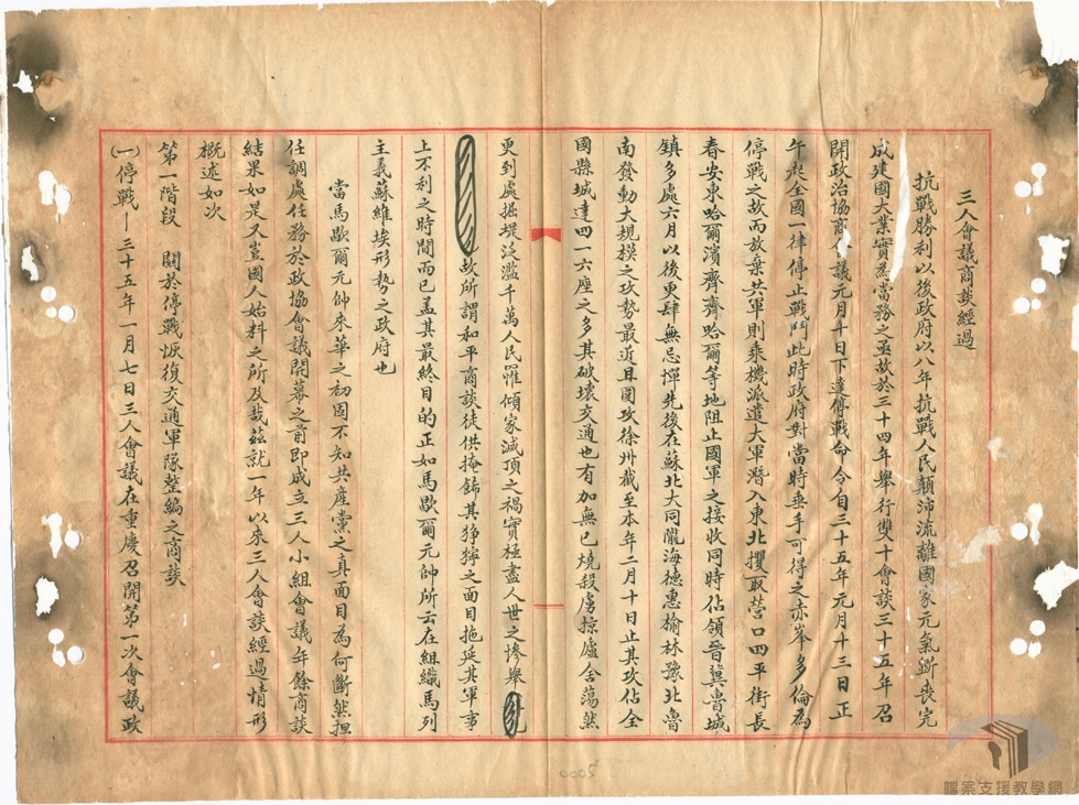 民國35年(1946)1月初,在馬歇爾(George Catlett Marshall.Jr)的調停下,由馬歇爾、周恩來、張群組成軍事三人小組,研議停戰協定,國民政府發布一月停戰令。同時,為討論抗戰勝利後的重建問題,解決政治上的歧異,包容各界的意見,於民國35年(1946)1月10日正式於重慶召開政治協商會議,分別就政府組織、施政綱領、國民大會、憲法草案、軍事問題等進行討論。