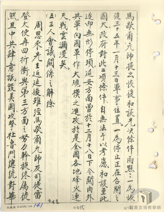 民國35年(1946)1月初,在馬歇爾(George Catlett Marshall.Jr)的調停下,由馬歇爾、周恩來、張群組成軍事三人小組,研議停戰協定,國民政府發布一月停戰令。同時,為討論抗戰勝利後的重建問題,解決政治上的歧異,包容各界的意見,於民國35年(1946)1月10日正式於重慶召開政治協商會議,分別就政府組織、施政綱領、國民大會、憲法草案、軍事問題等進行討論。