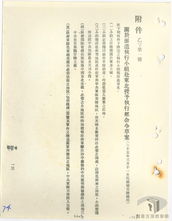 對於東北的停戰與接收問題,三人會議於民國35年(1946)3月11日開始討論,政府代表張治中、中共代表周恩來、美國代表馬歇爾。馬歇爾提出「關於派遣執行小組赴東北授予執行部命令草案」,其中「政府軍有權佔領恢復中國東北主權」,周恩來認為國軍可藉口佔領任何地區,無法接受。13日,因馬歇爾返美,美方改由吉倫將軍出席提出修正版,三方再進行多次會議討論,仍未能取得共識。4月8日,舉行第七次會議,政府方面改由陳誠出席;次日第八次會議,仍無法達成協議。