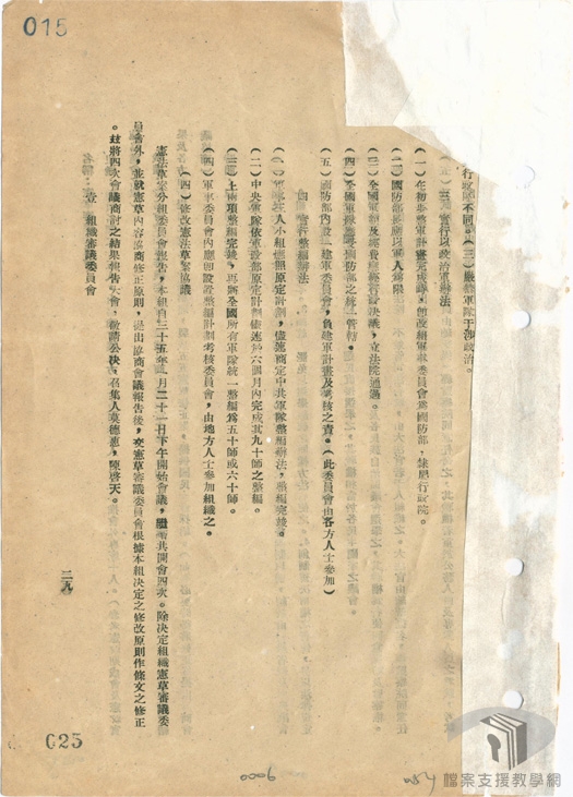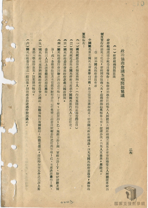 民國35年(1946)1月初,在馬歇爾(George Catlett Marshall.Jr)的調停下,由馬歇爾、周恩來、張群組成軍事三人小組,研議停戰協定,國民政府發布一月停戰令。同時,為討論抗戰勝利後的重建問題,解決政治上的歧異,包容各界的意見,於民國35年(1946)1月10日正式於重慶召開政治協商會議,分別就政府組織、施政綱領、國民大會、憲法草案、軍事問題等進行討論。