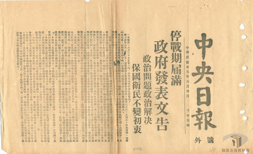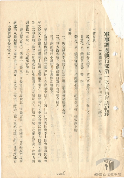 民國35年(1946)1月初,在馬歇爾(George Catlett Marshall.Jr)的調停下,由馬歇爾、周恩來、張群組成軍事三人小組,研議停戰協定,國民政府發布一月停戰令。同時,為討論抗戰勝利後的重建問題,解決政治上的歧異,包容各界的意見,於民國35年(1946)1月10日正式於重慶召開政治協商會議,分別就政府組織、施政綱領、國民大會、憲法草案、軍事問題等進行討論。