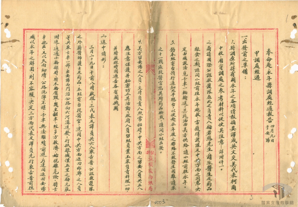 民國35年(1946)2月25日,美國代表馬歇爾、國民政府代表張治中、中共代表周恩來,簽訂「關於軍隊整編及統編中共部隊為國軍之基本方案」。軍事調處執行部為執行整編的事務性工作,下設有整軍處。整軍處為協調國軍與共軍的整編方案,共召開過19次會議。會議同樣由國民政府、中共、美國三方代表出席,針對軍隊整編的事務性問題進行討論,如國共兩軍的編配、部隊的編制方式等。