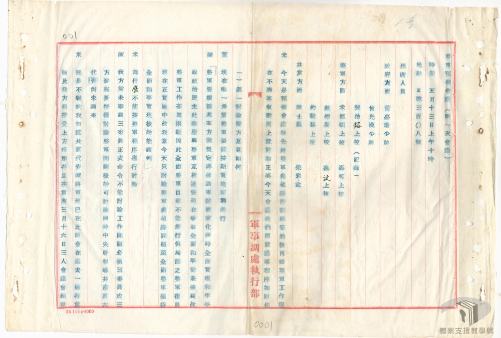 民國35年(1946)1月10日,由國民政府代表張群、中共代表周恩來、美國代表馬歇爾所組成的軍事三人小組會議,簽訂設立軍事調處執行部(簡稱「軍調部」),以執行停戰與整軍的相關事宜。民國35年(1946)1月,軍調部設於北平協和醫院舊址。軍調部及其下組織的運作方式,都是以「三人委員會」為藍本,由三方代表共同參與。本部由國民政府委員鄭介民、中共委員葉劍英、美國委員羅伯遜所組成;三方各自有獨立的辦公室,各項措施須經三方委員一致同意後,正式訓令則是以中華民國政府主席名義發布。軍調部的主要工作為:執行國共兩軍的停戰、恢復華北華中的交通、執行國軍之整編與共軍統編為國軍。國民政府雖於民國35年(1946)1、6、11月共3次發布停戰令,實際上是打打停停,尤其下半年戰況轉趨擴大,軍事調處工作難以執行。民國36年(1947)1月馬歇爾離華,美方決定退出軍調部,該部工作結束。