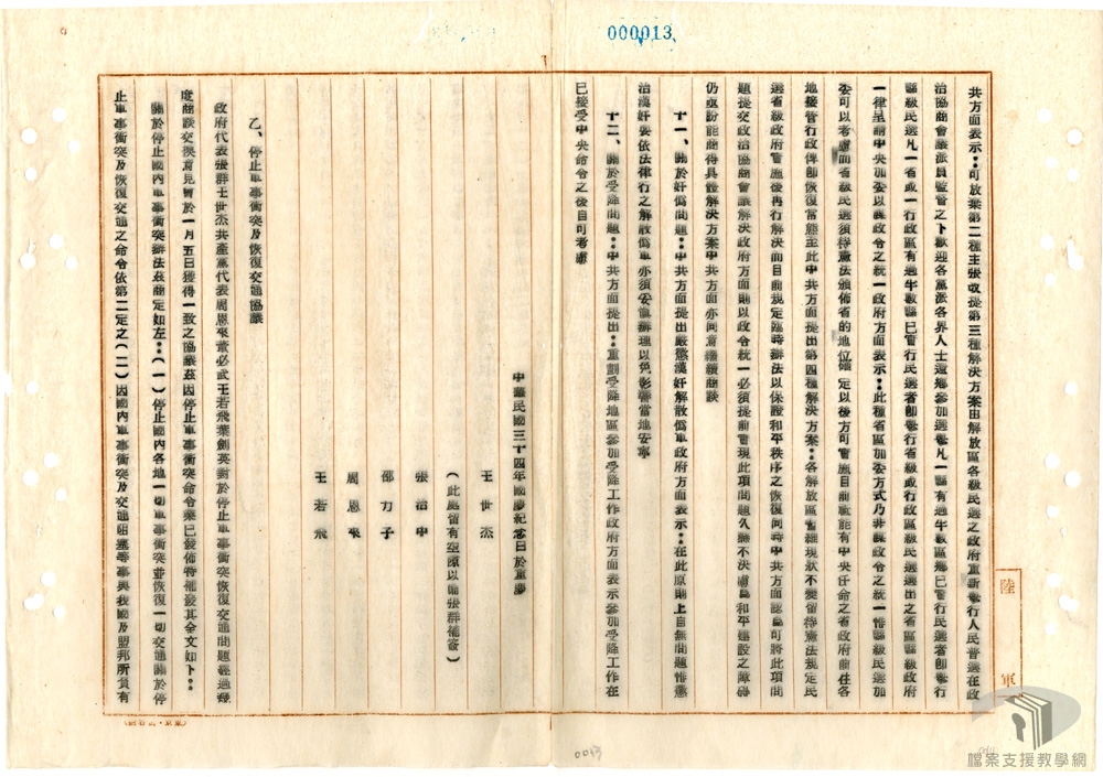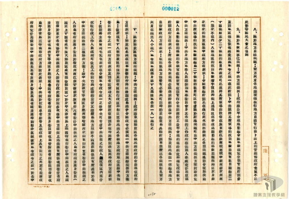 民國34年(1945)10月10日,政府與中共代表於重慶簽署「國民政府與中共代表會談紀要」,又稱為「雙十會談紀要」或「雙十協定」。內容共計12點:和平建國方針、政治民主化問題、國民大會問題、人民自由問題、黨派合法問題、特務機關問題、釋放政治犯問題、地方自治問題、軍隊國家化問題、「解放區」地方政府問題、奸偽問題、受降問題。會談紀要的發表,對實質問題解決有限,但在政治上則相互承認,並達成繼續協商之意願。
