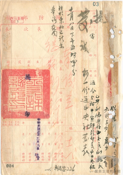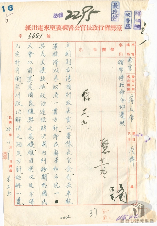 民國35年(1946),國民政府與中共在軍事調處的過程中衝突不斷,至民國36年(1947)7月,和談未能邁向和平,因應戰爭擴大,國民政府下令動員戡亂,進入全面開戰階段。從民國37年(1948)9月至民國38年(1949)1月間,遼瀋會戰、平津會戰、徐蚌會戰等三大會戰,國軍精銳盡失,大陸政局丕變。民國38年(1949)1月21日,蔣中正宣布下野,由副總統李宗仁代行總統職權。李宗仁設法與中共談判停戰,派出政府和平商談代表團,由張治中任首席代表;中共方面由周恩來任首席代表。4月1日起,於北平展開和談,然雙方和談破裂,共軍渡江。至38年(1949)底,國軍多已退出大陸,蔣中正為求復興基地臺灣之安全,建立反共前哨站,控制金門、廈門、舟山、大陳、海南等東南沿海島嶼,全力遏止共軍渡海襲臺,經金門、登步等戰役的勝利,穩定住臺灣海峽戰局。