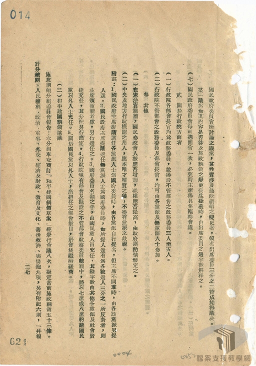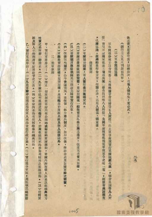 民國35年(1946)1月31日,政治協商會議閉幕,共計通過5項議案:一、政府組織問題;二、和平建國綱領協議;三、軍事問題;四、修改憲法草案協議;五、國民大會問題協議。政府改組方面:國民黨在國民大會未舉行前,修改國民政府組織法,以充實國民政府委員。和平建國綱領:通過「和平建國綱領草案」,概分:人民權利、政治、軍事、外交、經濟、財政、教育及文化、善後救濟、僑胞等9項53條。軍事問題方面:以軍隊屬於國家為建軍原則,以軍黨分治、軍民分治為整軍原則,實行以政治軍辦法,實行軍隊整編。