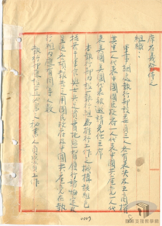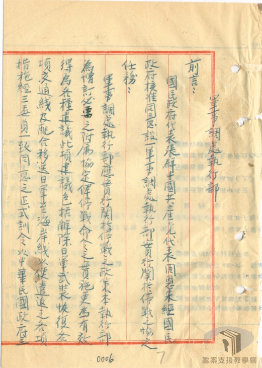 民國34年(1945)底,美國為調停抗戰結束後的國共關係,指派前陸軍參謀長馬歇爾將軍來華。馬歇爾來華後,由國民政府、中共、美國三方組成「軍事三人小組」,國民政府委員起初是張群(後改為張治中)、中共委員是周恩來,美國委員即為馬歇爾。軍事三人小組為執行軍事調處,下設「軍事調處執行部」(簡稱軍調部)。民國35年(1946)1月,軍調部設於北平協和醫院舊址。