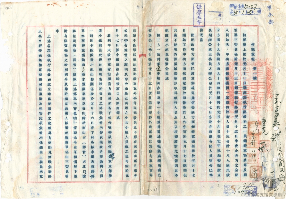 民國35年(1946)1月初,在馬歇爾(George Catlett Marshall.Jr)的調停下,由馬歇爾、周恩來、張群組成軍事三人小組,研議停戰協定,國民政府發布一月停戰令。同時,為討論抗戰勝利後的重建問題,解決政治上的歧異,包容各界的意見,於民國35年(1946)1月10日正式於重慶召開政治協商會議,分別就政府組織、施政綱領、國民大會、憲法草案、軍事問題等進行討論。