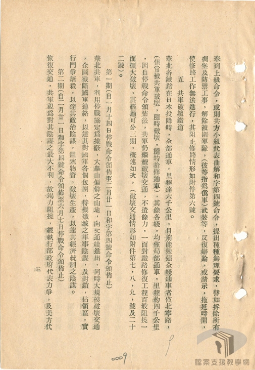 軍事調處執行部根據和字第四號命令,於民國35年(1946)2月13日成立鐵路管理科(後改為交通處),協助交通部恢復華北被破壞的鐵路。鐵路管理科由政府、中共、美國三方派代表組成。2月18日,聯合科長會議決定華北鐵路的修復順序:津浦鐵路、膠濟鐵路、隴海鐵路、平綏鐵路、平漢鐵路、同蒲鐵路、平承鐵路、正太鐵路等8條。2月19日,聯合科長會議再決定派出8個鐵路小組。鐵路為內陸交通之動脈,具有高度的戰略價值,所以國共戰爭過程中,鐵路交通常成為爭相控制的目標。