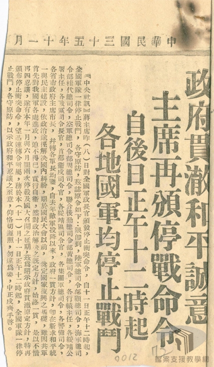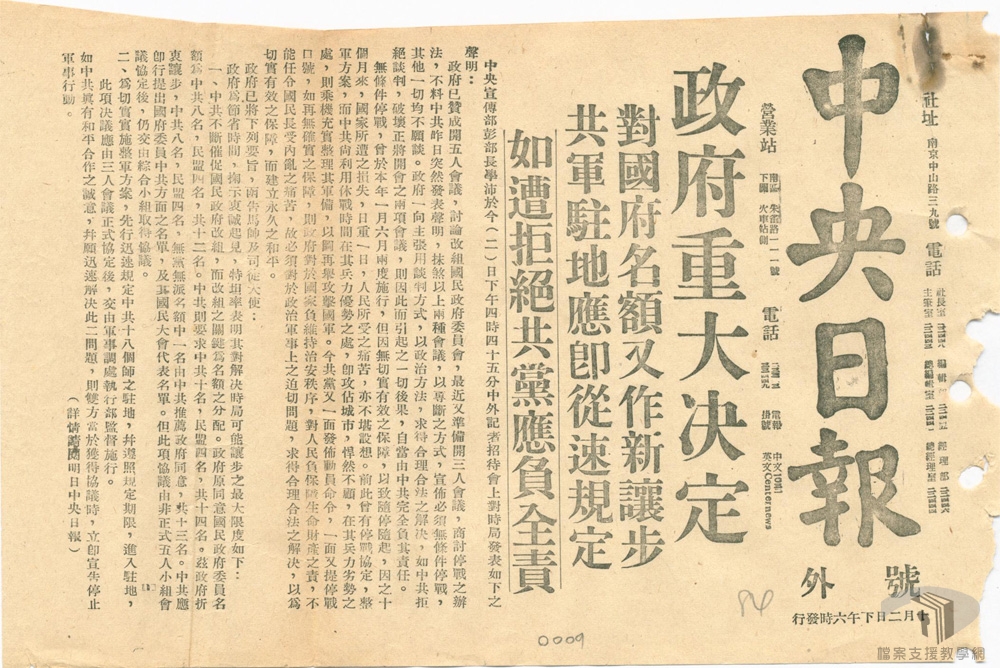 民國25年(1936)12月12日,西北剿匪副司令張學良與楊虎城,於西安發動「兵變」劫持蔣中正,此即「西安事變」。事件和平解決後,民國26年(1937)1月,裁撤西北剿匪總部,改變「攘外必先安內」的基本國策,對中共問題尋求政治解決。民國26年(1937)2月起,國民政府與中共談判,中共同意結束分離主義、暫緩階級鬥爭運動,國民政府則宣布承認中共合法,並同意將紅軍改編為國民革命軍第八路軍,稱之為「國共合作」。