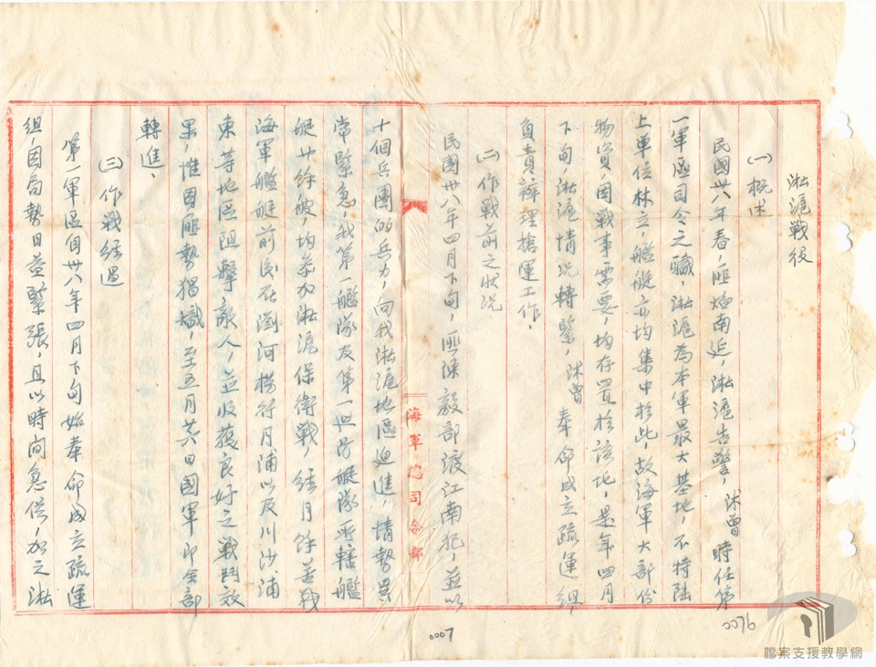 淞滬保衛戰中,隨著浦東及上海市區大部陷於敵手,國軍為使江浙閩海岸以東,有可用之兵,以鞏固復興基地臺灣,因此將可移物質盡量搶運臺灣,另在舟山、金廈間建築反攻基地。民國38年(1949)5月25日夜間,開始淞滬撤退行動,由滬西及浦東兩兵團指揮官統一部署撤退掩護,按照船隻碼頭分配表,規定撤退順序,並派兵掌握船舶,及其從業人員清理與警戒碼頭,控制道路交通。至26日拂曉後,最後船舶駛出吳淞口。船隻出入均在夜間,共軍砲火雖不斷射擊,國軍船舶僅有數艘受傷。27日後陸續抵達舟山,旋奉令分別留駐該島及轉運臺灣。