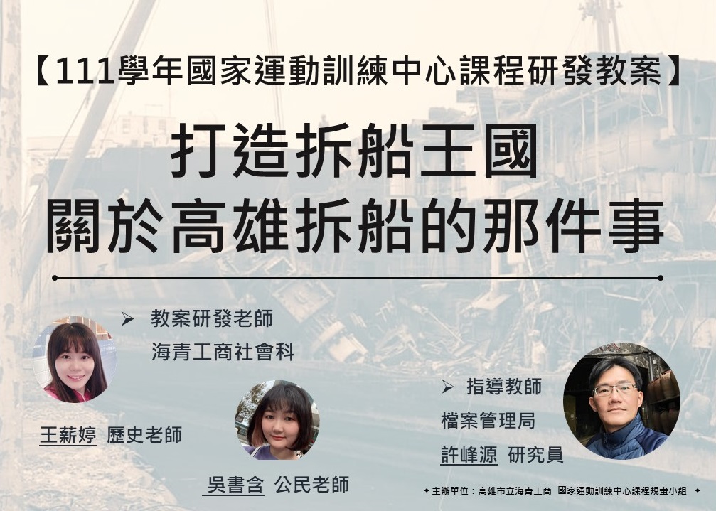 檔案局與國家運動訓練中心高中專班專聘教師社群共同辦理「檔案資料融入教案教師增能工作坊」,完成「關於高雄拆船的那件事」教案內容,以歷史科與公民跨學科合作的視角,探尋高雄港運務脈絡,並以人權發展的核心價值,檢視拆船工人的待遇及生活保障。此外檔案局許峰源研究員與高雄市立海青工商林世芝老師還受邀至國立教育廣播電臺《Tea Time時光》節目,一同分享國家檔案運用於教案設計過程。
