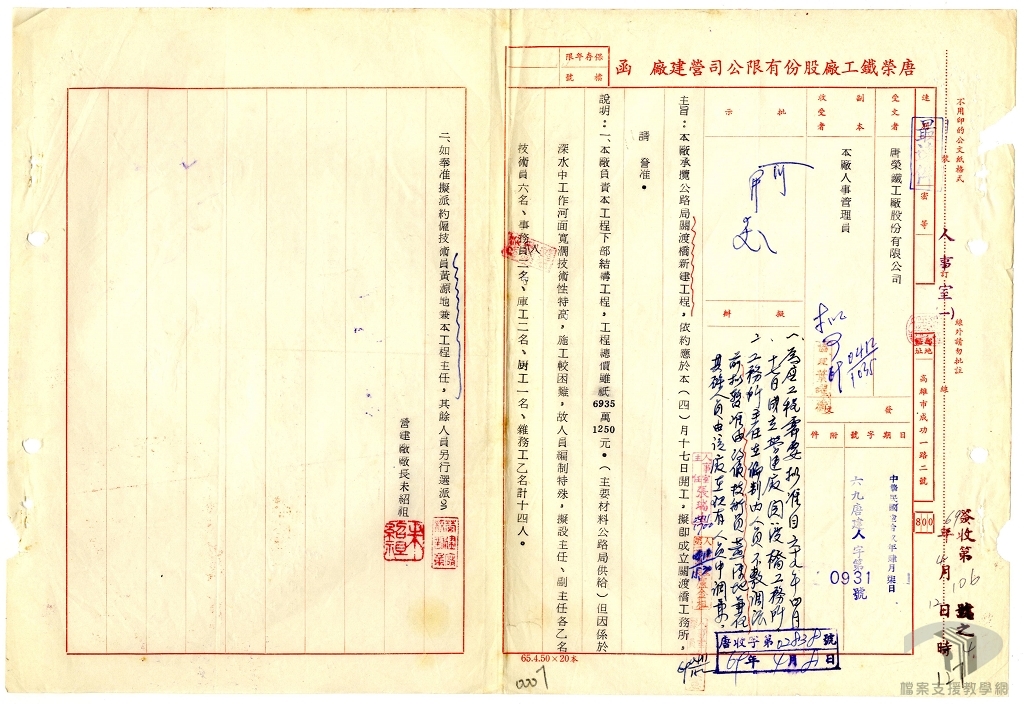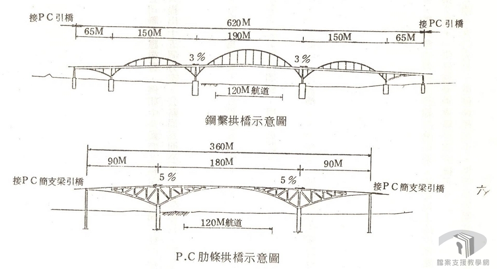 說明 關於要委託哪些單位建橋,新工處認為:本工程主橋結構新穎,水準極高,引道與聯絡路線工程繁重,工程費超出主橋造價兩倍以上,應與設備完善、監造經驗豐富的榮工處議價。主橋鋼拱架部分則由唐榮、中船及台北鐵工廠比價決定。