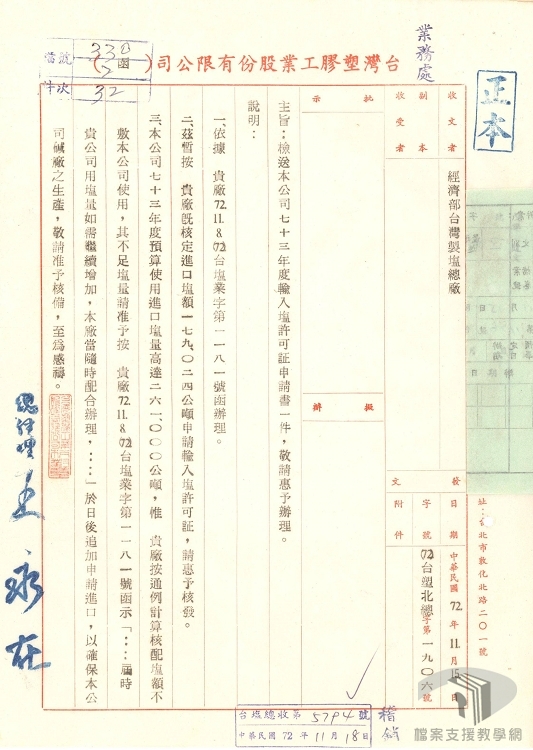戰後隨著臺灣經濟與工業的發展,食鹽、農、漁、工業用鹽需求不斷增加,1960年代已漸不敷使用,1970年代因應鹼氯工業發展,臺灣製鹽總廠訂頒國外購鹽方法,以國內自產鹽供應為主,不足以供應時,則由臺灣製鹽總廠進口調節,或由廠商根據用鹽需求申請配額,自行辦理進口。