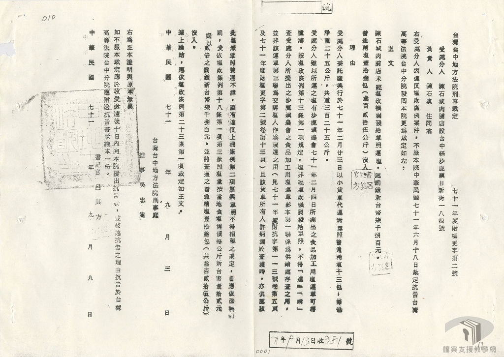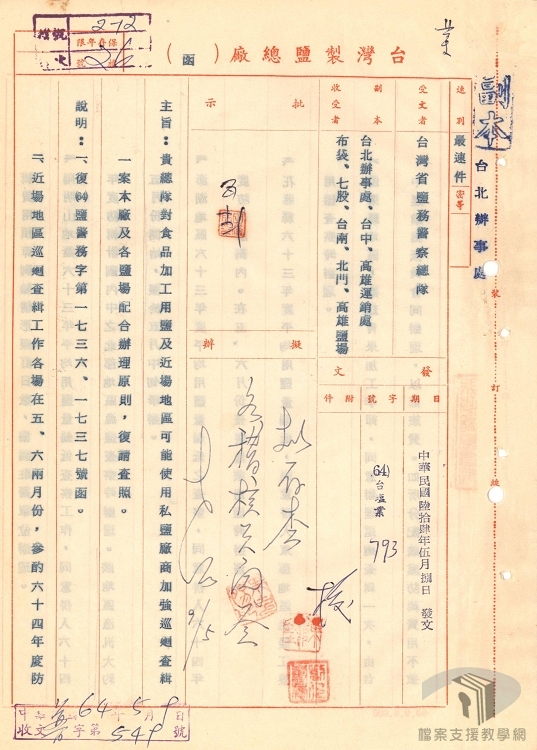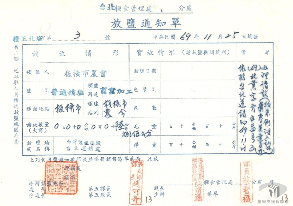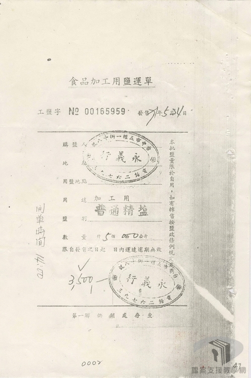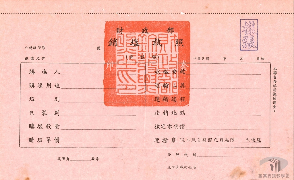 1978年8月臺灣製鹽總廠訂定〈使用鹽運銷單照管理要點〉,單照種類計有「銷售憑單」、「銷鹽執照」、「運鹽執照」、「放鹽通知」等四種,必須有這些單照才能進行鹽的運銷。