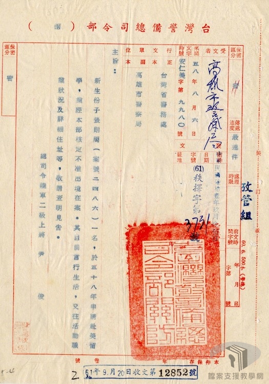 威權統治時期的校園師生受難者,一旦遠離故鄉,也常遇到無法返鄉的情形。舉例來說,編號1.2.5.1檔案素材提到的彭明敏,遠走美國後,長期無法回到臺灣,而其在他鄉的活動情形,仍受遠在臺灣的中華民國政府密切監控。