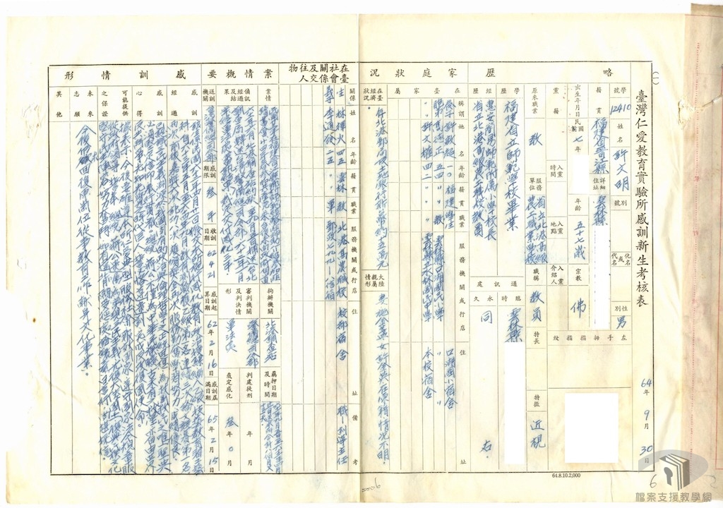 除了被處以徒刑,感化亦是威權統治時期校園師生受難者常見的遭遇。所謂感化,名義上是以政治教育和思想改造為主,實際上卻和徒刑一樣,是失去自由,在精神上所受折磨甚至可能更大。 以教師身份被捕、後被判感化的受難者許文明,便是一例。