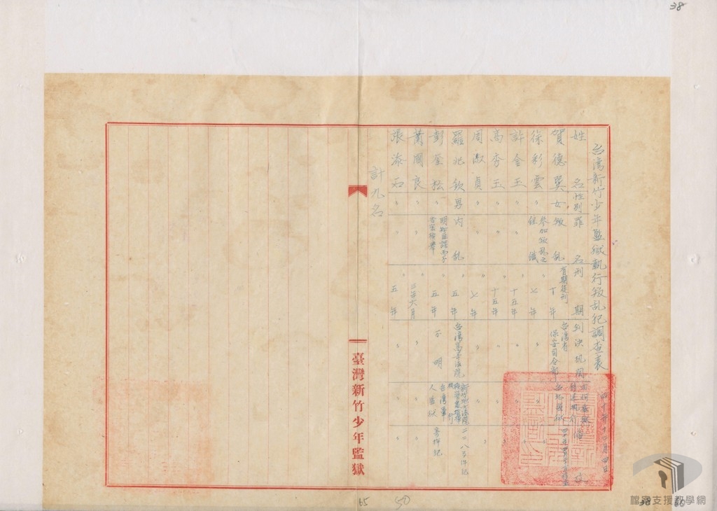 另外還有一處特殊的關押地為新竹少年監獄,民國40年(1951)年時有5名女性,分別為賀德巽、徐彩雲、許金玉、高秀玉、周淑貞關押於此。