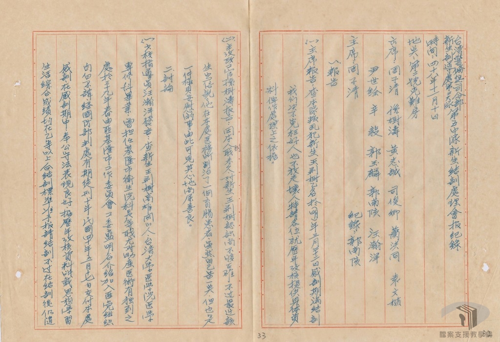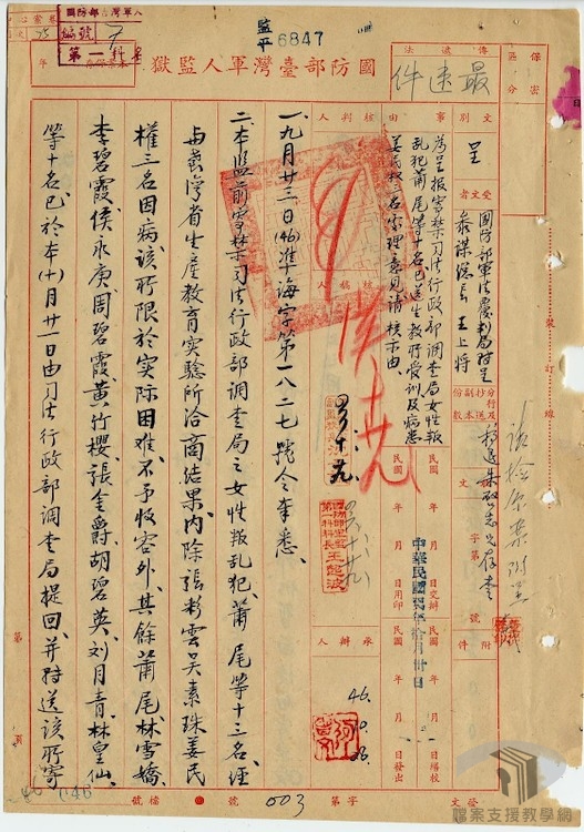 檔案中可見到幾位女性受難者從原本由司法行政部調查局寄禁在軍人監獄,民國46年(1957)年9月國防部令軍人監獄將她們送往生產教育實驗所服刑。軍人監獄回覆這13名女性叛亂犯,經過與生產教育實驗所洽商,除了張彩雲、吳素珠、姜民權三人因病,實驗所限於實際困難不予收容之外,其餘蕭尾、林雪嬌、李碧霞、侯永庚、周碧霞、黃竹櫻、張金爵、胡碧英、劉月青、林皇仙這10人轉送生產教育實驗所寄禁。隔年民國47年(1958)年9月軍人監獄行文給新店鎮公所通知將蕭尾等10名的戶籍遷出至生教所,從〈戶籍登記申請書〉可知政治犯的戶籍是掛在所屬的監獄單位,例如蕭尾等人關押在軍人監獄時,所屬的戶籍為「共同生活事業戶」,共同事業戶戶長即是當時軍人監獄典獄長李正漢。