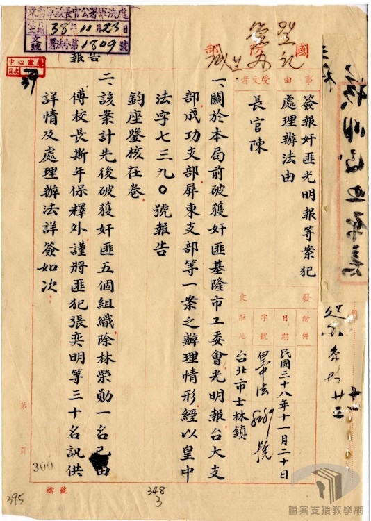 《光明報》是中共地下黨在臺灣最主要發行的地下刊物,創辦於民國37年(1948)年秋季,主要由基隆中學支部負責編印,此案於民國38年(1949)年8月遭保密局破獲。涉案及遭牽連的30位人士中,女性有張奕明、蔣蘊瑜、戴芷芳、林獻香等四名。除了潛伏在臺的共產黨員、本名張瑞芝的張奕明負責印刷刊物及「反動口號」,而判處死刑,其餘四位本省籍女性皆因涉案不深,僅交付感訓。