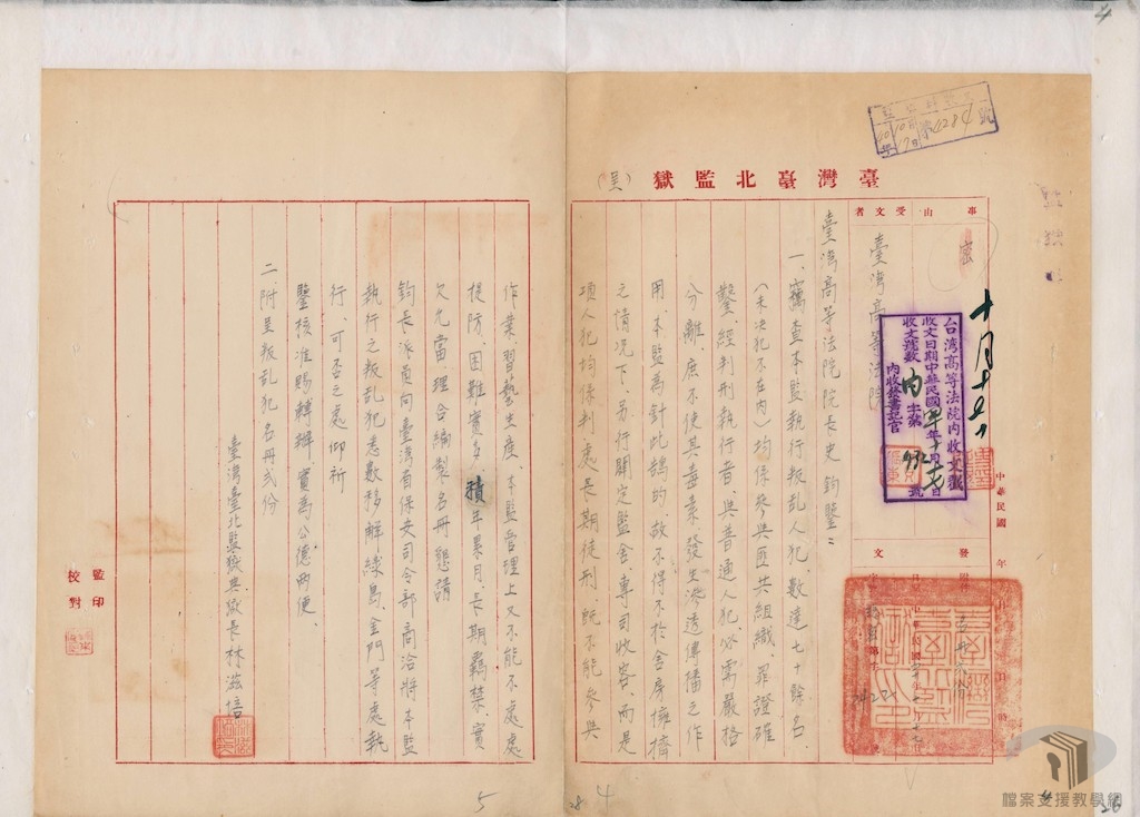 在民國69年(1980)年7月1日審檢分隸之前,監獄隸屬於司法行政部(1980年改制為法務部,2011年再改制為法務部矯正署),例如現今的法務部矯正署臺北監獄,前身為屬於司法體系的臺灣臺北監獄。雖然監獄屬於司法體系,但在戒嚴時期關押臺灣省保安司令部寄押的叛亂犯。使得臺北監獄典獄長在民國40年(1951)年向臺灣高等法院提出報告,指出臺北監獄在日治時代設立,按照規定僅能收容人犯1,200名,在二次大戰時監獄受盟軍轟炸,監舍倒塌兩棟,以每棟監舍可容納200名人犯計算,已經減少400名的空間。二戰後一直到民國40年(1951)年,由於經費短缺遲遲未修復監舍。加上監獄內已經收容包含叛亂犯79名以及軍事犯、司法犯等人犯,共有一千五百餘人,已經超收一倍的人數。因此典獄長請高等法院向臺灣省保安司令部洽商,將臺北監獄內的叛亂犯移到綠島或金門等處執行徒刑。最後,保安司令部核准將該監所的政治犯移到綠島。