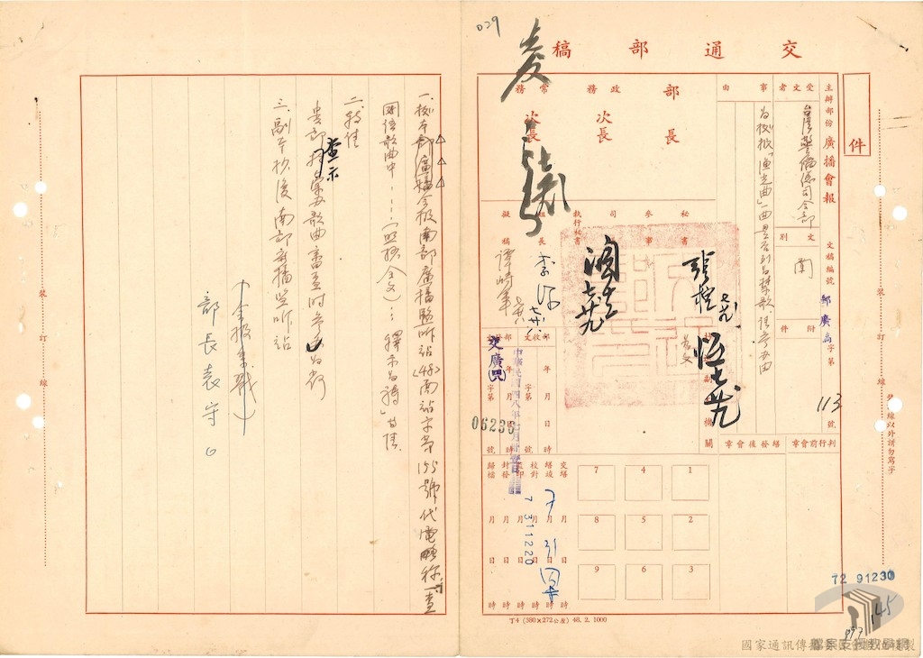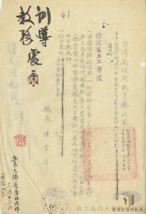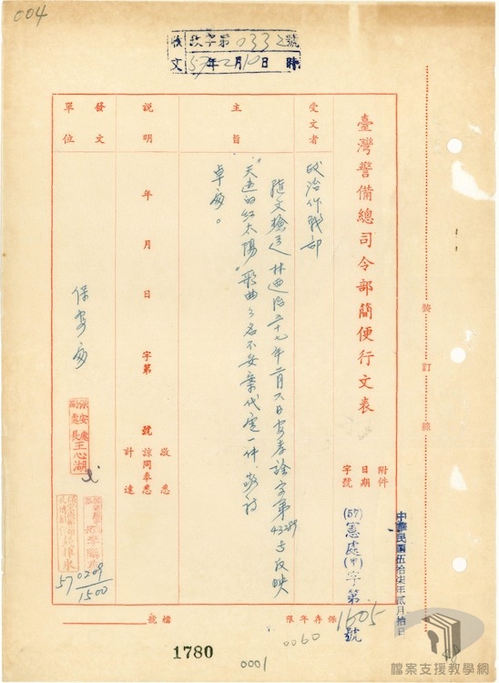 民國59年(1970)行政院經修訂公布的〈臺灣地區戒嚴時期出版物管制辦法〉,第二條明示凡匪酋、匪幹之作品或譯音及匪偽之出版物一律查禁,第三條第三款規定若為共匪宣傳者,都將查禁。在國家檔案裡,有許多查禁中共相關歌曲的紀錄,可茲對照。
