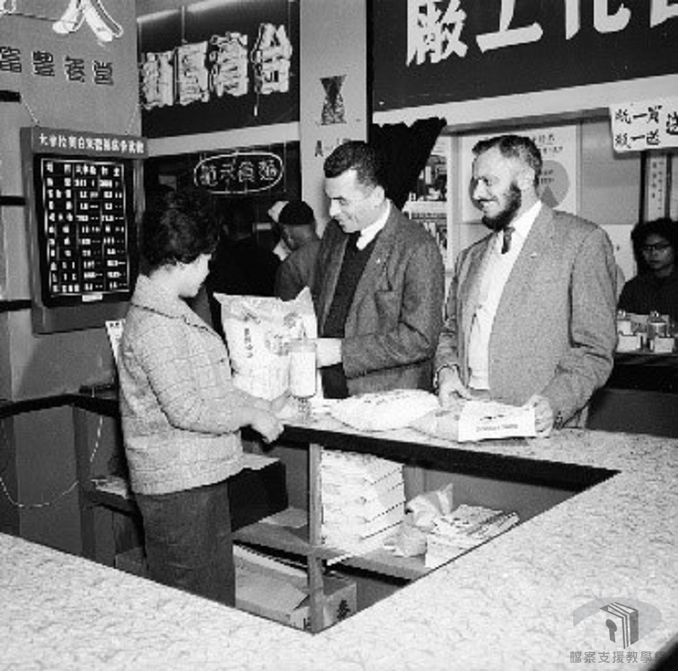 照片內的學生們正一個個領取營養午餐,這是屬於「推行學童營養午餐計畫」的一部分,開始於1957年,是我國有計畫推行學童營養午餐供應工作之始,由臺灣省教育廳與中國農村復興聯合委員會合作展開。至1961年止,共計有百所國民小學的學生就像圖中的孩子們一樣,加入試辦營養午餐計畫的行列。